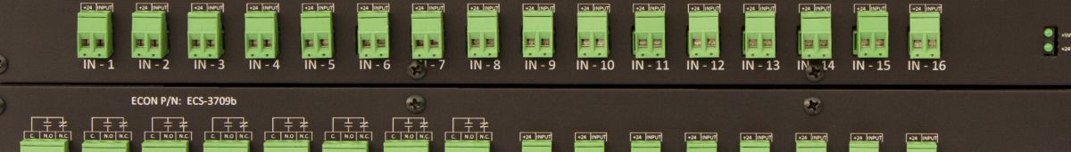 The IOC provides 8 form C relay outputs and 8 sourcing inputs which can be set to require either a N.O. or N.C. connection for normal status. Each output includes a terminal for Relay common, a N.O terminal and a N.C. terminal. Each input includes a +24 vdc output and a status input for monitoring. Like all ECON I/O, the IOC allows users to associate any input in the system with any output.